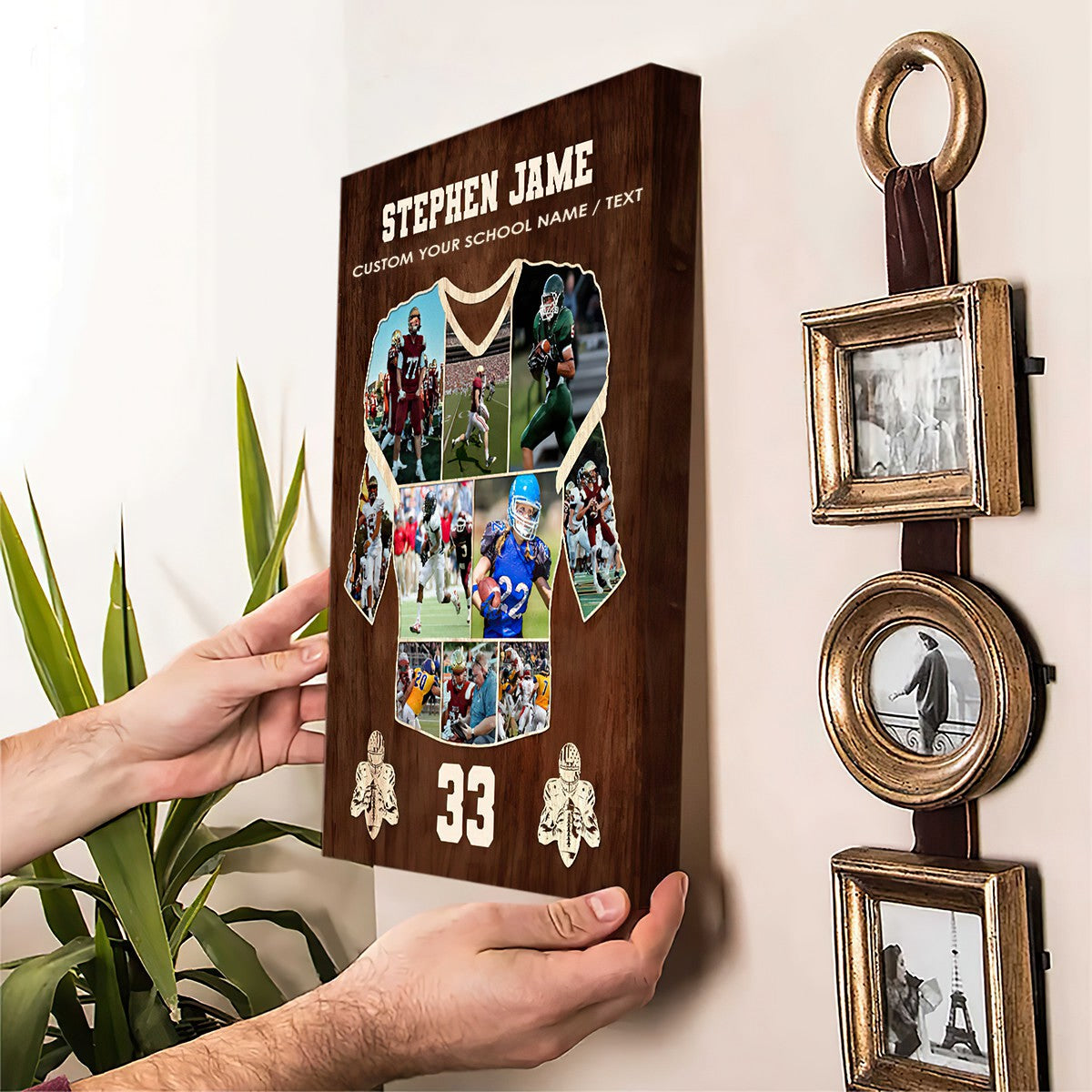 • A personalized football jersey photo collage canvas makes a thoughtful and meaningful gift that celebrates your passion for the sport.