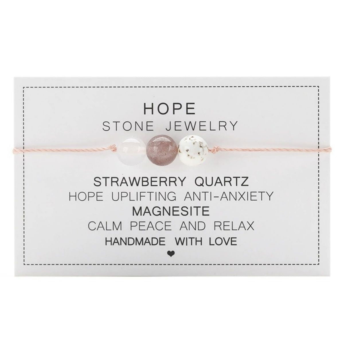 • Hope with Strawberry Quartz (hope, uplifting, anti-anxiety) and Magnesite (calm, peace and relax)