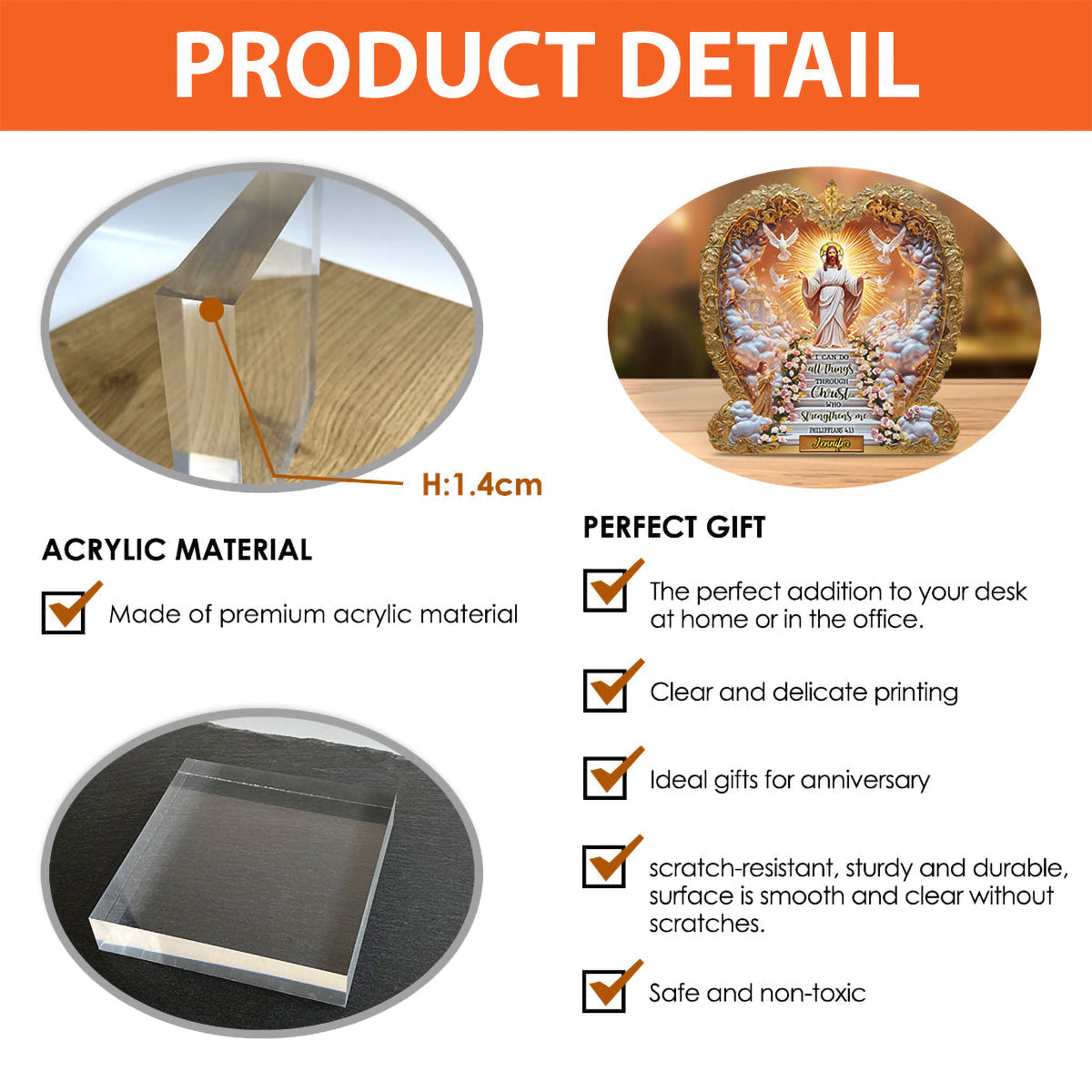 šThis beautifully crafted acrylic plaque serves as a daily reminder of faith and strength. With the inspiring phrase "I Can Do All Things" engraved on a custom shaped design. This plaque serves as a constant reminder of your strength and perseverance.