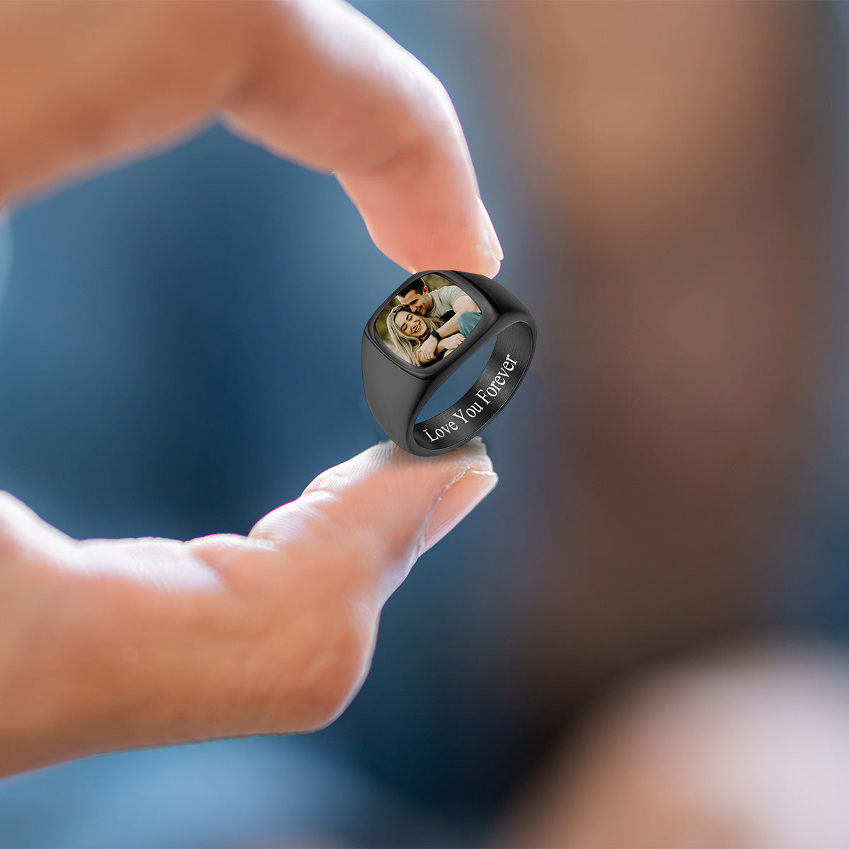 This personalized square ring for couples features the words between you and allows you to upload a unique photo. Made with high-quality materials and expert craftsmanship, it serves as a beautiful reminder of your eternal love. Cherish your special moments with this one-of-a-kind ring.