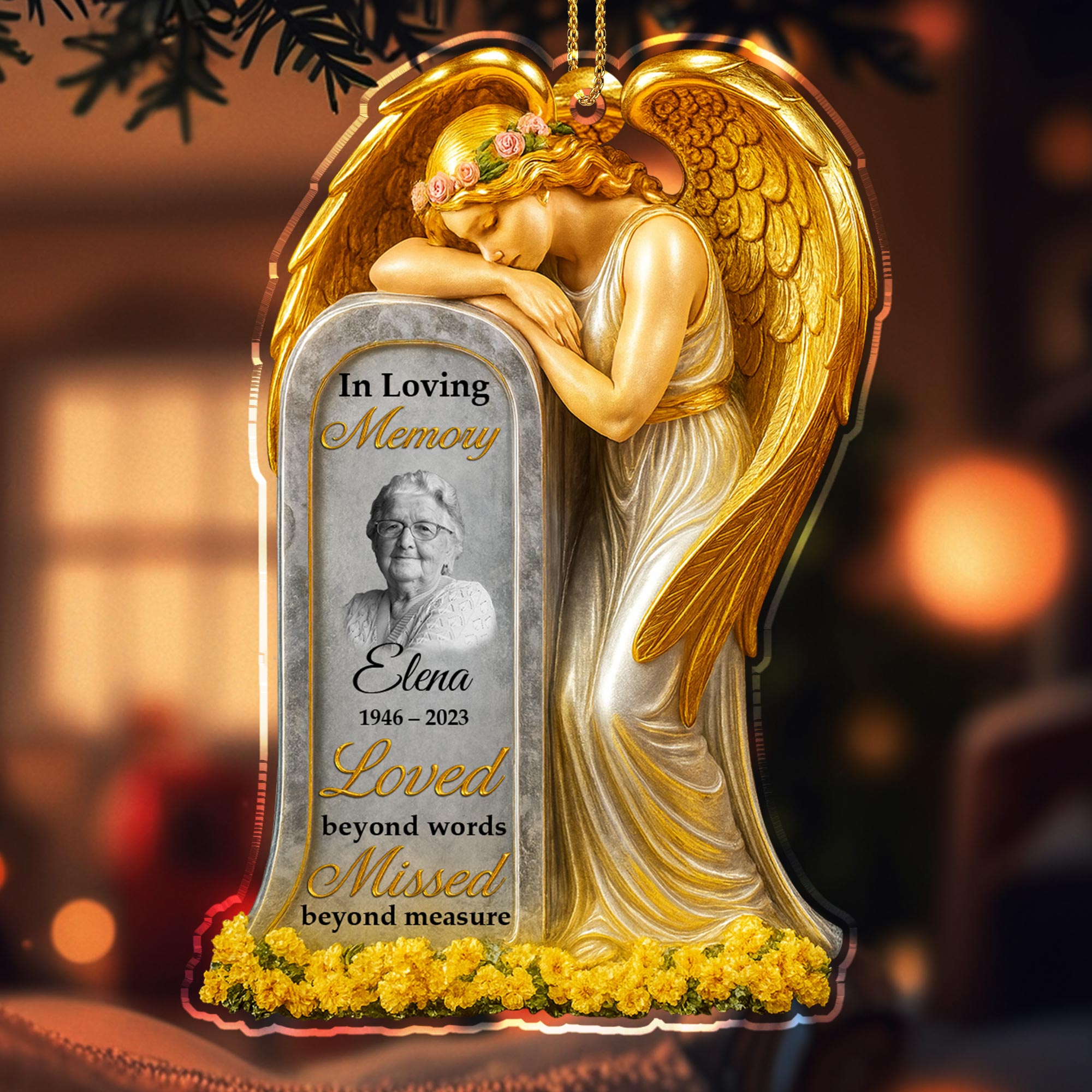 This "Loved Beyond Words" angel and floral custom acrylic memorial ornament, with its gentle and delicate design, helps you express your deep longing for a loved one who has passed away.