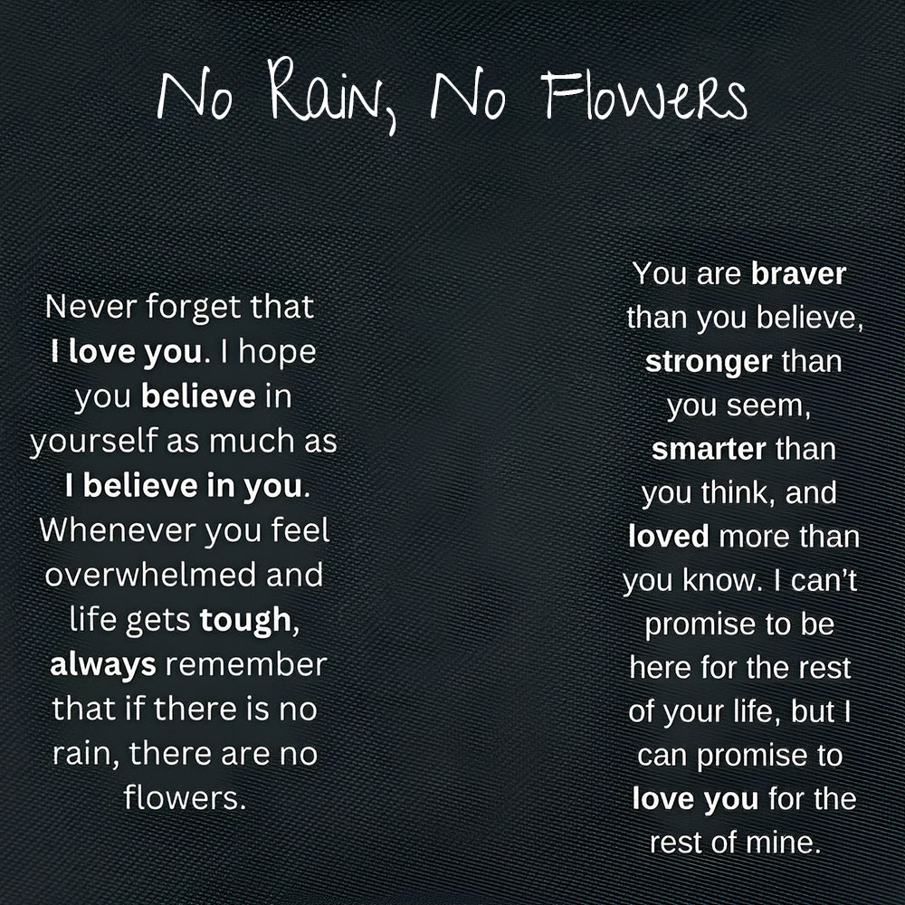 Exclusive Message Card: "No Rain, No Flowers - Never forget that I love you. I hope you believe in yourself as much as I believe in you. Whenever you feel overwhelmed and life gets tough, always remember that if there is no rain, there are no flowers. You are braver than you believe, stronger than you seem, smarter than you think, and loved more than you know. I can't promise to be here for the rest of your life, but I can promise to love you for the rest of mine."