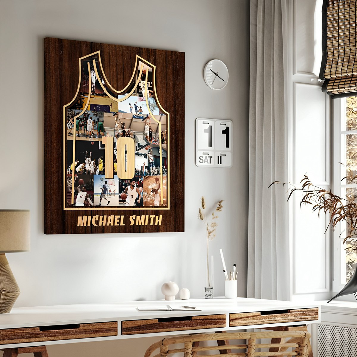 • A personalized basketball jersey photo collage canvas makes a thoughtful and meaningful gift that celebrates your passion for the sport.