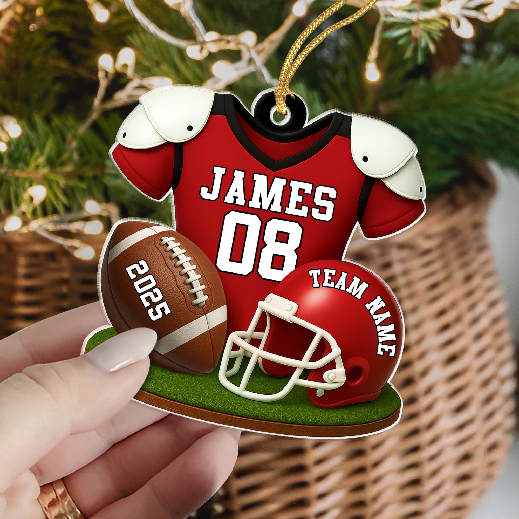 Score big this holiday season with our playful American Football ornament! Made from clear acrylic, this personalized decoration lets you add a name or message, making it a perfect gift for football lovers and players. Lightweight and durable, it brings sporty cheer and festive fun to any Christmas tree. Kick off your celebrations with a touch of game day spirit!๐๐