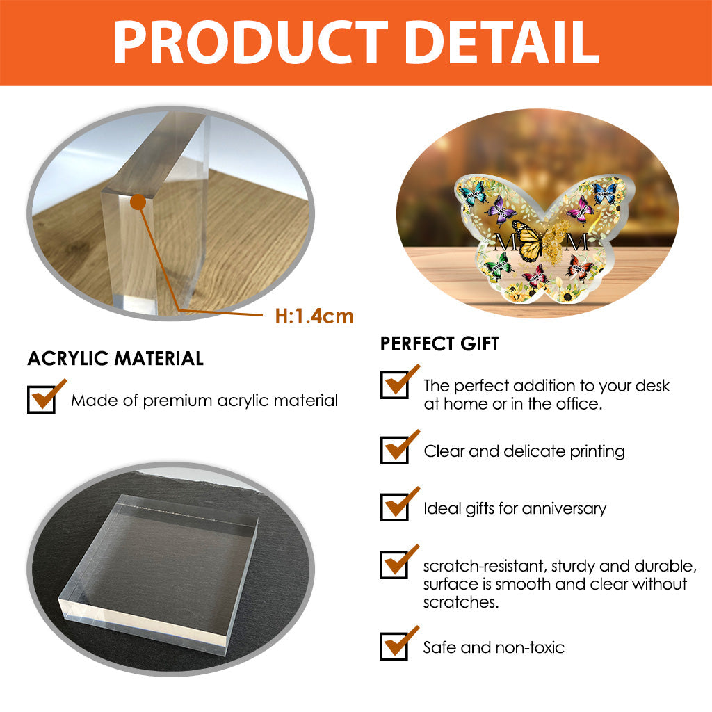 Celebrate the unbreakable bond between mother and child with our personalized Mom And Kids Floral Butterflies plaque. Made with high-quality acrylic and custom shaped, this gift is a beautiful and heartfelt way to show your love and appreciation. Perfect for any occasion, it's a unique and meaningful present that will surely bring joy to any mother's heart!💖✨