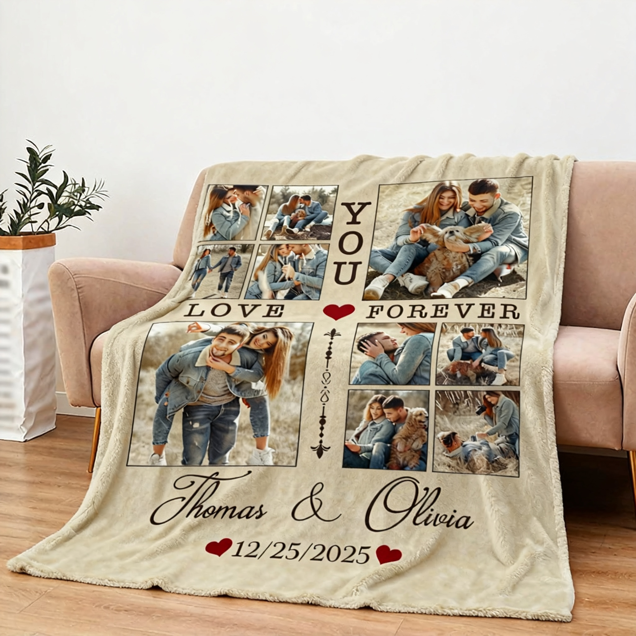 Wrap yourselves in cherished memories with this personalized couple blanket, custom-designed with your favorite photos. Perfect for anniversaries, Valentine's Day, or any occasion celebrating your love story, this thoughtful gift transforms precious moments into a cozy keepsake. The photo collage design lets you showcase multiple images that matter most, creating a unique blanket that's as special as your relationship. Ideal for snuggling together, decorating your space, or giving to that special someone who means everything to you.šš§”