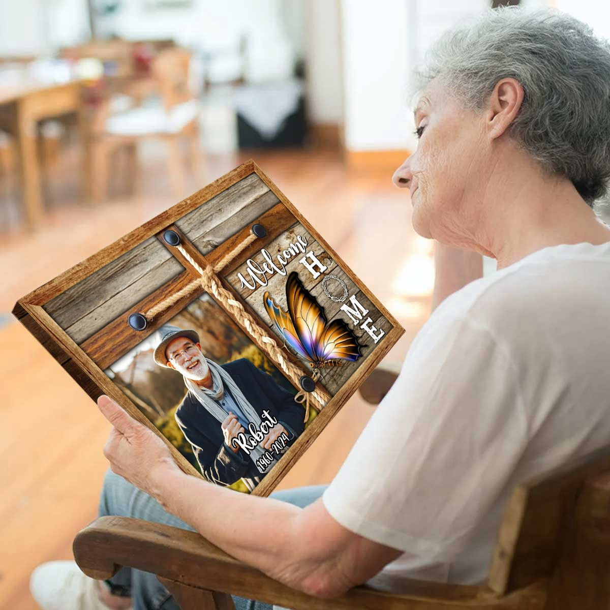 Personalized Memorial Photo Welcome Home Butterfly Cross Canvas Poster